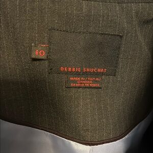 Elevate your style with this classic pinstripe blazer by Debbie Shuchat. Made in Canada. Quality details including lovely sky blue satin lining. Perfect for any formal occasion. Excellent condition.