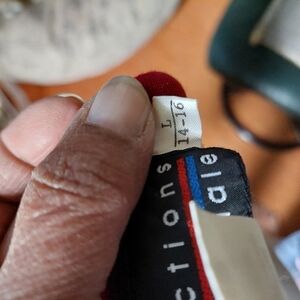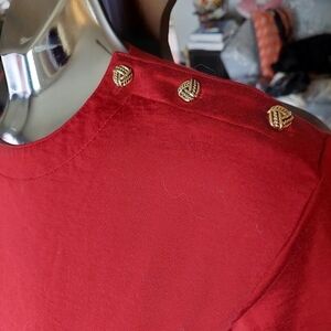 This pullover is deep red in colour. Short sleeves. 3-button shoulder. Breast pocket. Rayon/cotton. Size L (14-16). Collections Internationale.