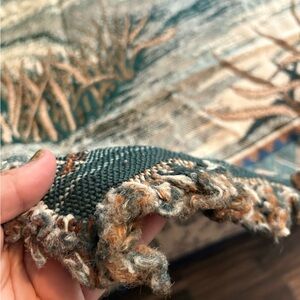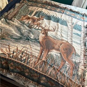 Cozy throw with a serene deer and forest design. Ideal for nature enthusiasts. Adds warmth and charm to any space. Measurements are 50” x 59”. A few minor picks and trip needs to be brushed out.