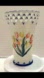 Hand-painted tulips in red, yellow, and green; Textured raised floral motif; Pierced/reticulated top with blue trim; Scalloped rim.