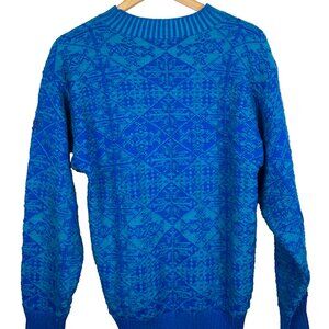 Vintage Demetre ski sweater from the early1990's. Knit in royal blue and turquoise wool in intricate nordic patterns. Lightweight but warm with ribbed collar, cuffs and hem.
