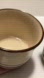 Neutral solid stoneware in beige with brown speckled base and dark brown stripe around top edge and raised dark brown stripes above the base.