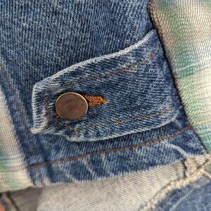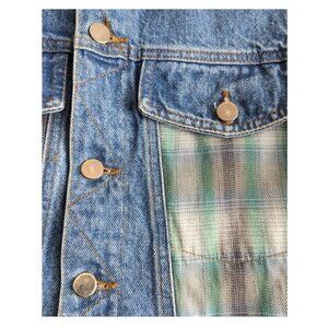 Beautiful metal buttons with flap buttons. Quality denim and vintage wash. 100% cotton. Plaud panels of mixture of brown/grey/green. Little button tab sides.