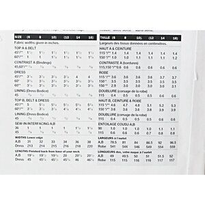 Close-fitting top has collar, slits, contrast binding and belt. Dress, below mid-calf, has close-fitting, lined bodice with pleated upper section extending to side back, back straps, flared skirt, snap closing on upper section and side zipper.