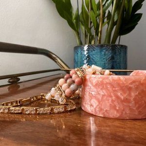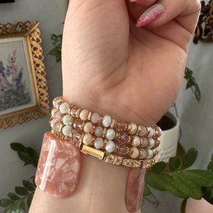 3. Pink Stone Bead Bracelet: This stretch bracelet has 9 beautiful pink stones at the focal point surrounded by white, pink and gold beads. The stones appear to be a mixture of Rhodonite, Rose Quartz, Morganite and more! Approx. 7in around without being stretched. This bracelet rounds out this trio perfectly!