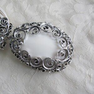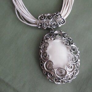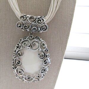 Vintage JK Jewel Kade white ceramic oval pendant encased in a silver tone scroll frame. The bale is also large and with the same scroll pattern. The pendant with bale measures 4" in length by 2". This is on a 16" multi strand white cord.
