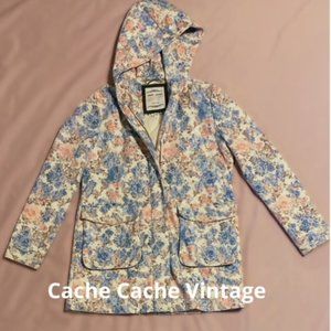 1980's to early 90's vintage jacket from Parisian brand, Cache Cache. Size large, floral print, with a lace overlay, this jacket is sweet and feminine, yet sturdy. Drawstring waist allows for optimal fit, and hood prevents hair style nightmares! This jacket is in perfect condition, with the exception of a few washable pen marks on the inside lining. Whether you are taking a walk in the park on a spring day, or meeting your besties for brunch, this beautiful piece of french fashion has you covered.