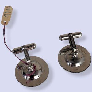 These vintage cufflinks by Destino are made of sterling silver and have patented shanks/feet (stamped pat. 2093723, pat. 2544893). The face of each cufflink is round with a textured edge. The centers are sunken and have what looks like a black pearl as a decorative feature (though I am unable to confirm if this is a real black pearl or some other stone). Both pieces are stamped Sterling on the shank opposite the patent numbers. There is some uneven tarnishing and wear throughout and one of the shank joints is slightly loose, but the set is still very wearable. The original tag for the piece is still attached and says 79.95.