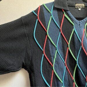 Add a bold retro touch to your wardrobe with this vintage 90s knit sweater. Features a classic black base with a vibrant multicolor diamond pattern in red, green, and blue. Designed with a collared V-neckline and relaxed fit for comfort and style. A unique statement piece that pairs well with jeans or slacks for a standout look.
