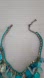 Double strand stunning statement necklace consisting of faux turquoise stones and beads, dichroic glass and abalone shells. The upper layer of beads dangle from a twisted matt turquoise ribbon. The lower strand consists of round glossy abalone shells hanging from a gold tone chain. The chain shows signs of slight tarnish. There are 3 round broken abalone shells in the lower strand but they are hard to spot given how busy the necklace is. The price has been discounted to account for the call outs.. 21" in length. Sold as is.