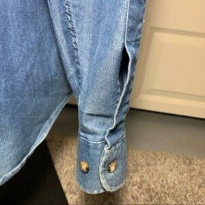 In good pre owned condition. From the 90's good quality material chambray thin denim, oversized shirt button down, Small embroidery logo on chest pocket. **Wears on wrists hems but no holes. Relaxed fit. Please see pictures