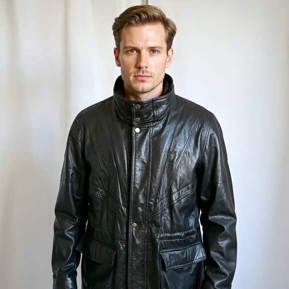 Step into bold 1980s fashion with this vintage Dimitri leather jacket, crafted in Canada and built to impress. Designed with sharp geometric paneling, a structured high collar with star-embossed brass snap buttons, and oversized flap pockets, this piece captures the edgy confidence of retro moto outerwear. The genuine leather exterior is soft yet structured, featuring a full YKK zip closure and padded shoulders for an iconic silhouette. Perfect for streetwear styling, fall layering, or collectors of vintage Canadian-made leatherwear.