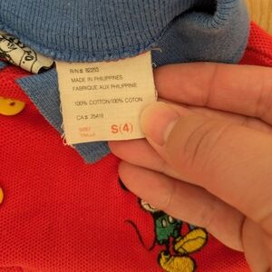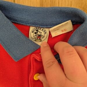 Vibrant red polo with blue collar. Features playful Mickey design. Ideal for everyday wear.