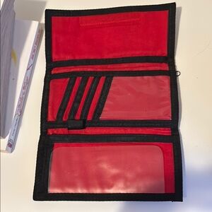 Charming wallet featuring a bear embroidery. Brown and red color scheme.