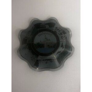 This charming vintage souvenir glass plate from Disneyland was sold in the 1970's and is made from grey translucent smoke glass with ruffled edges. The plate is printed with a colorful design featuring some of the highlights of Disneyland in the 1970's including Sleeping Beauty's Castle, Mark Twain's Steamboat, Tomorrowland and much more. The piece is in good used condition with no chips or cracks and excellent color quality.