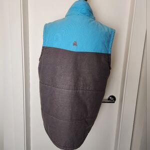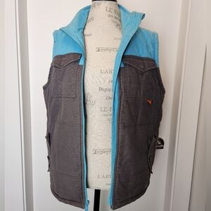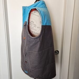 Charcoal Grey & light Blue waxed Denim Zipup Puffer Utility Vest with magnetic flap side and chest Pockets, by KID ROBOT.