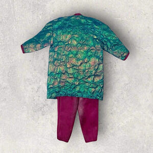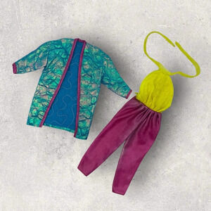 Vtg 1985 Barbie and the Rockers 1st Issue Diva Concert Outfit Pantsuit & Jacket is a stunning two-piece set for your Fashion Doll. This special occasion ensemble includes a yellow and purple jumpsuit paired with a matching blue jacket. This vintage Barbie outfit is a must-have for collectors of Barbie and the Rockers memorabilia.