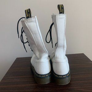 White mid-calf height Dr. Martens with laces up and zip closure. Fair vintage condition. Some scuffs.