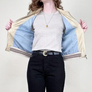 This Dolce & Gabbana beige leather bomber jacket features a full-zip front closure and distinctive ribbed knit cuffs and hem with striped detailing. Crafted from supple leather, it boasts two functional flap pockets at the front chest, blending utility with designer style. The piece is fully lined with a light blue stripe, adding a subtle pop of color and comfort