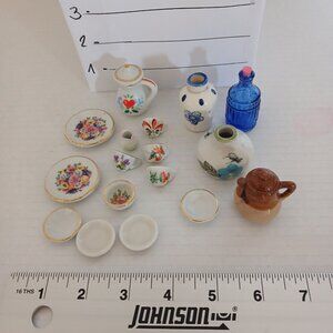 Vintage Dollhouse Miniature Lot Cups Plates Jug Pitcher Bottle Unmarked Ceramic or Porcelain or Glass