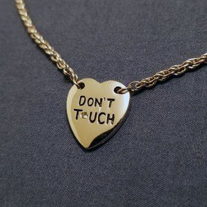 This necklace is from the mid-00's. The heart shaped pendant with attached rope chain has the phrase "DON'T TOUCH" stamped into it, with a white crystal accent letter. This is a short necklace of approximately 15" circumference, so it sits just a little looser than a choker or a proper collar necklace.