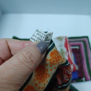 Add a touch of bohemian elegance to your outfit with this vintage Dorena scarf. Made in Italy from high-quality polyester satin, this square scarf features a colorful floral medallion pattern in shades of green and orange.