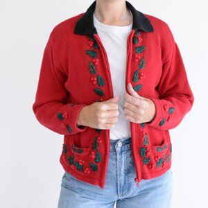 Vintage Dress Barn Christmas Holly Knit Zip Up Cardigan Sweater XL