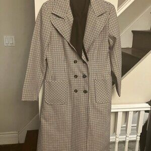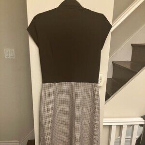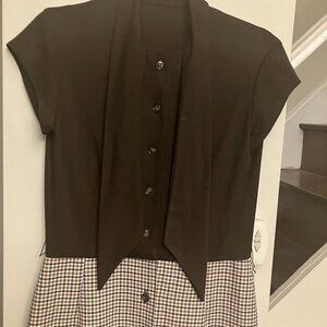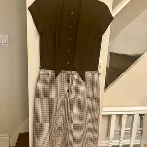 1970s set (dress and jacket) in EUC. Dress has a tie collar and is brown with a checked skirt. Jacket is the same check. Medium weight.