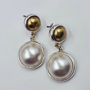 🤍Vintage Drop Dangle Stud Earrings – White & Olive Faux Pearl, Silver-Tone Metal, 1990s.