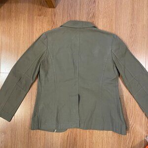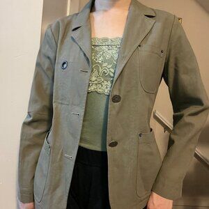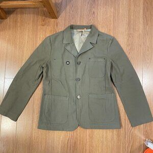 This olive green collared jacket by offers a stylish and functional design. Crafted with durable materials, it features a button-up front and multiple pockets for practicality. Perfect for layering, its versatile color and classic silhouette make it suitable for both casual outfits.