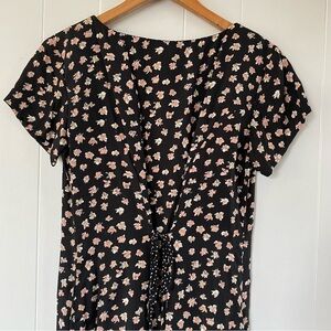 How cute is this dress?! Made in the USA by ED Michaels. Dainty and feminine floral print. Abalone shell buttons. Ties at the back. Excellent condition. Vintage size 4. Model is 5’2”, 105lbs. Usually wears a 0 or XS.