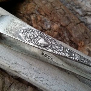 Very pretty sugar tongs spoon with floral and heart (I think it is heart) design, would be a great gift for your mom or somebody special. Hallmarked EPNS.