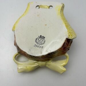 Vintage ESD Japan ceramic anthropomorphic cat wall pocket. This adorable knick knack from the 50s is designed to hang from the built-in ribbon and hold lightweight items or a small plant. Sporting a flowered straw hat and yellow bow, this stylish orange tabby is ready to cheer up your space.