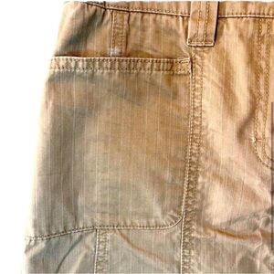 Giving all the Y2K vibes. Cotton Esprit mini skirt with tons of details. Seaming in the front leads to four front pleats at the bottom hem. Two front patch pockets. Subtle white pinstripe in the khaki fabric. Belt hoops. Back yoke. Very subtle A-line falls above the knee. Excellent condition.