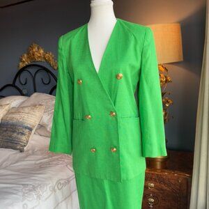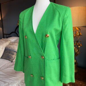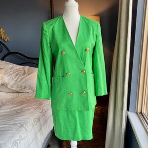 Vintage early 1990s green blazer and skirt set with gold buttons by Minikin. Blazer is size 4, skirt size 6. Excellent used condition. Blazer has shoulder pads, is double breasted without lapels, and has a v neck. Buttons are spiral gold with a slight conical shape. 80% viscose 20% linen, made in Canada. Cat friendly, nonsmoking home.