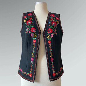 Vintage Eastern European Floral Embroidered Black Felt Wool Sleeveless Vest