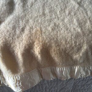Preloved Condition with some minor small stains (I did not try to get the stains out before I washed but was not put into the dryer so might come out). There is one patch that looks a bit darker. There is a picture, however in person it is not as noticeable. The other call out is 2 small tears on the trimming. Please look at pictures and feel free to send me a message with any questions. Considering the age of the blanket, I am impressed with the condition of it. No fraying on the edges at all.