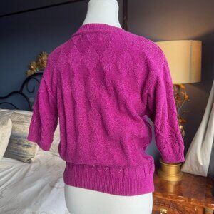 Vintage (late 80s-mid 90s) short sleeved knit crew neck sweater, size Small Petite. Purplish Fuschia sweater with metallic threads and gold accents with a faint argyle print. Great vintage condition, has two missing gold studs on front as shown in photo 8 but only noticed now after wearing for a while. Bust measures 17 inches laying flat, length from shoulder to hem is 22.75 inches. Cat friendly, nonsmoking home.