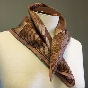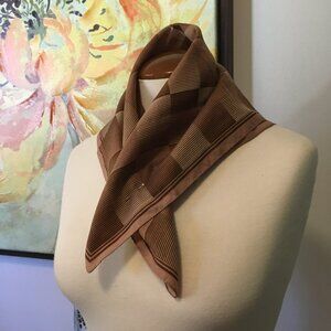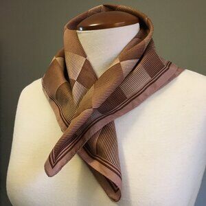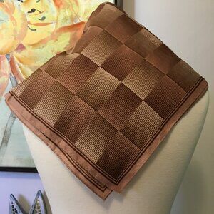 Very good preowned vintage condition, square scarf by Eatons featuring an illusionist pattern of checkers and lines in beige and brown. Made in Italy, this vintage gem is easy to match because of its simplicity and two tone appearance.