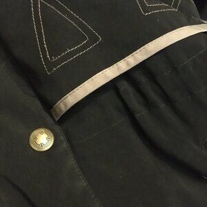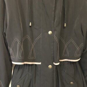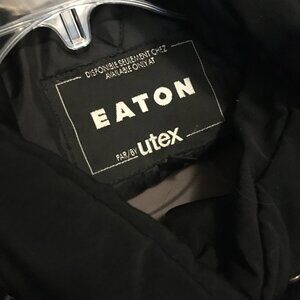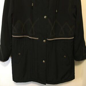 Very good preowned vintage condition, black winter coat with tan accents, hood lining, piping and brown stitching across the breasts and cuffs. Buttons are bronze tone and beautiful along with the draw string for the hoodie. There are pockets and a built in drawstring at the waist to tighten as needed. I couldn't do this coat justice with the photos. I tried to take as many as I could. A true vintage gem. I believe it's a mens, but it could be worn as a womens as well. Like the trenchcoat I am selling this was exclusively made and sold at Eaton's.