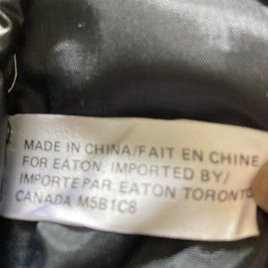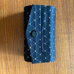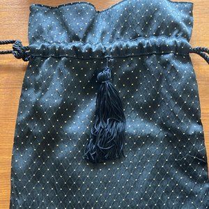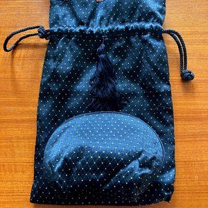 This 3-piece set includes a drawstring shoe bag, makeup bag, and lipstick case with mirror. In black satiny fabric with gold dots. In very good condition.