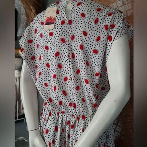 Step out in style with this funky vintage polka dot midi dress. Featuring an edgy red blue and white design, this dress is perfect for any occasion especially spring and summer. authentic item from the 1980s. still has boutique tag attached. Unsure of fabric, either viscose or polyester. elastic waist with keyhole button closure in back. Would fit a modern size medium best imo! see flat lay measurements below! Excellent vintage condition, no flaws to note!