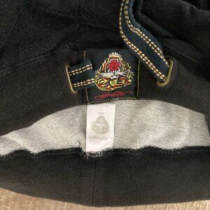 Discover the classic comfort and style of these vintage Ed Hardy sweatpants-style shorts, a perfect addition to any casual wardrobe. Featuring the iconic Ed Hardy brand, these black shorts are a size small and designed for a regular fit, ideal for men seeking both fashion and function. Embrace the Y2K trend with a piece that effortlessly captures the essence of the era. Whether you're lounging at home or out for a casual meet-up, these shorts offer a unique blend of retro design and modern comfort, making them a versatile choice for your everyday wear.