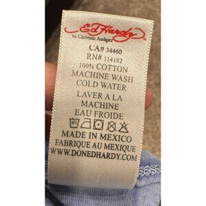The Vintage Ed Hardy Women's V Neck Bling Shirt in Skull Blue is a stylish and edgy top perfect for women who love a unique and bold look. This medium-sized T-shirt features a V-neckline and a striking skull design, adding a touch of attitude to any outfit. The colorful blue background adds a fun pop of color, making it a versatile piece that can be dressed up or down for any occasion. Made by the iconic brand Ed Hardy, this shirt is sure to make a statement and showcase your fashion-forward style.
