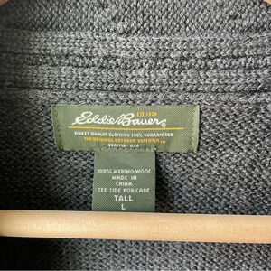 Vintage Eddie Bauer Merino Wool V Neck Knit Sweater. Deep V Neck, longline. Cable knit detail on neckline. Made with 100% merino wool. Dark grey. Size large tall. Excellent condition.