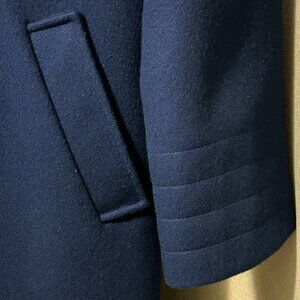 In great condition - no damage to coat or lining. The collar has the original brooch. Pleat detail on both front shoulder areas, deep pockets and very pretty stitching detail on both sleeve cuffs. Back features a decorative belt.