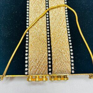 Step into timeless sophistication with our exquisite black velvet handbag, now available online! This vintage treasure is adorned with luxurious gold trim and sparkling faux diamonds, making it the perfect accessory for any formal event.