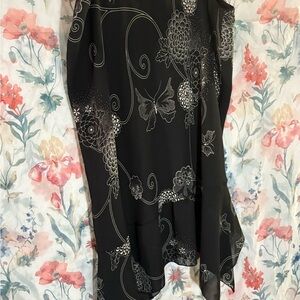 Stylish shawl with white floral design on black fabric. Ideal for a sophisticated look.
