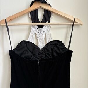 Chic black dress featuring delicate white lace detail. Perfect for formal occasions.