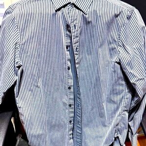 Step into effortless sophistication with this Michael Kors Men’s Dress Shirt. Featuring crisp vertical stripes in deep navy and white, this shirt is equal parts classic, polished, and versatile. Perfect for pairing with a tailored suit for a sharp office look or with dark denim for a smart casual vibe.